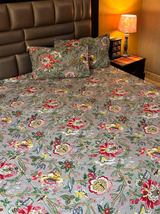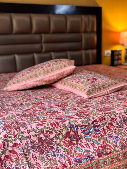 Mughal Bagh Collection - Hand Block Printed Super King Bedsheet with Reversible Pillow Covers (108 x 108 inches)
