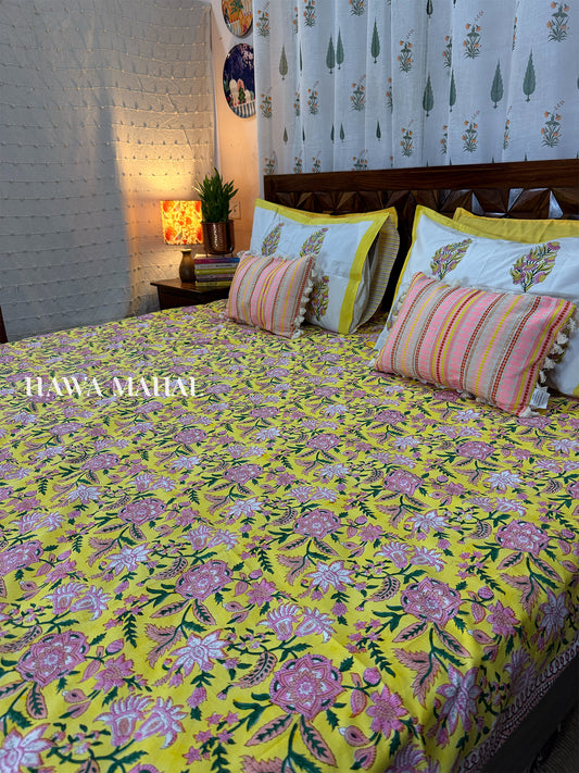 Mustard Hand Block Printed King Bedsheet with Reversible Pillow Covers (90 x 108 inches)