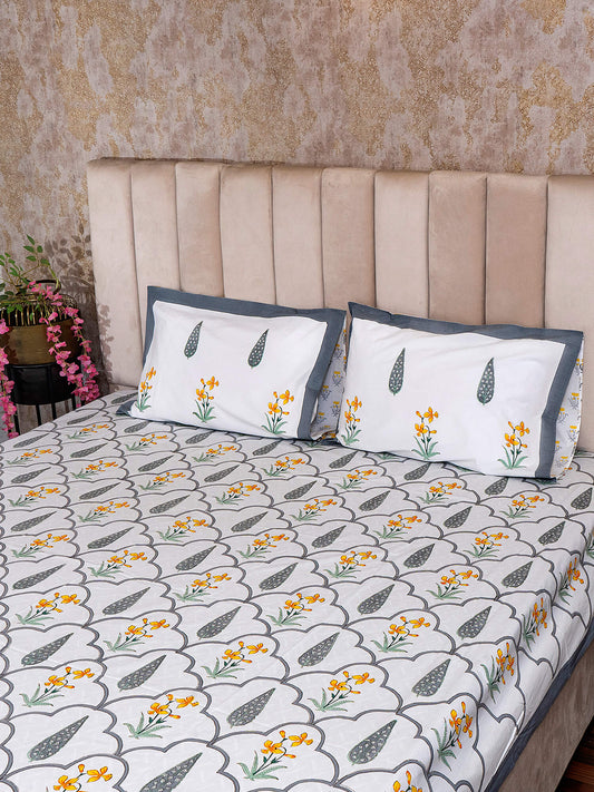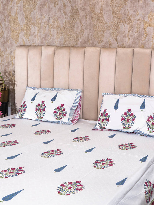 Meera Bagh Collection - Hand Block Printed Super King Bedsheet with Reversible Pillow Covers (108 x 108 inches)