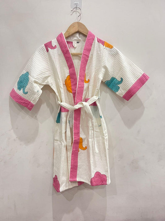 Hand Block Printed Kids Waffle Cotton Bathrobe - Elephants