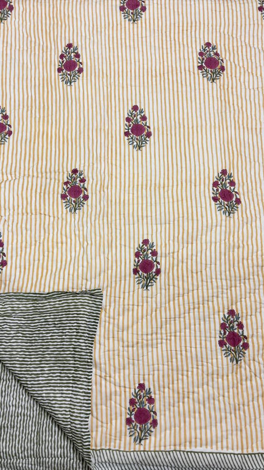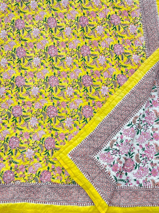 Yellow Handblock Printed Reversible Mulmul Cotton Quilt - Double (90 x 108 inch)