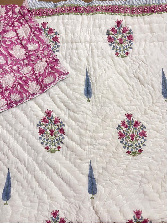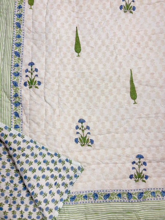 Handblock Jaipuri Quilt- Handblock Printed Reversible Mulmul Cotton Quilt - Double (90 x 108 inch)