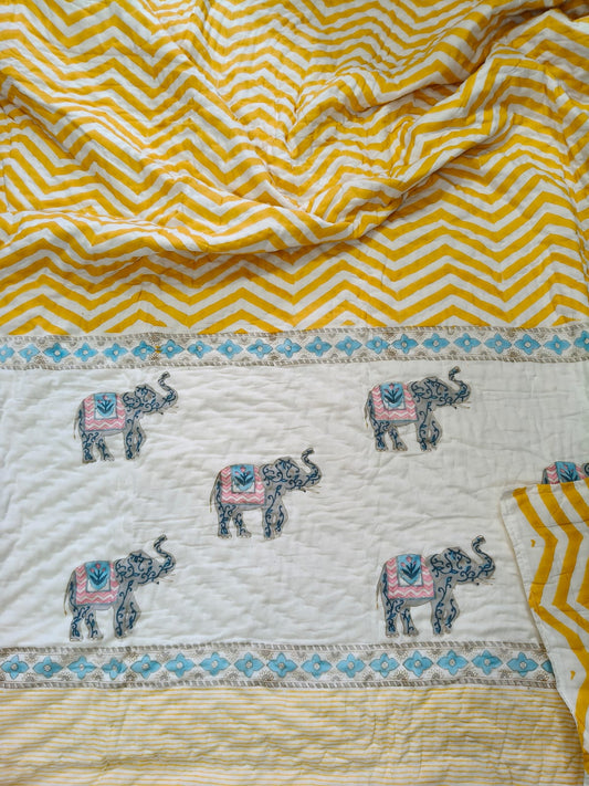 Yellow Zigzag Handblock Printed Reversible Mulmul Cotton Quilt - Double (90 x 108 inch)