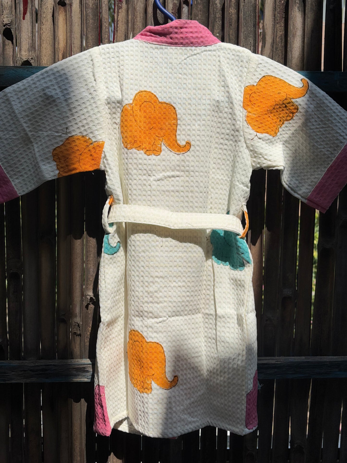 Hand Block Printed Kids Waffle Cotton Bathrobe - Elephants