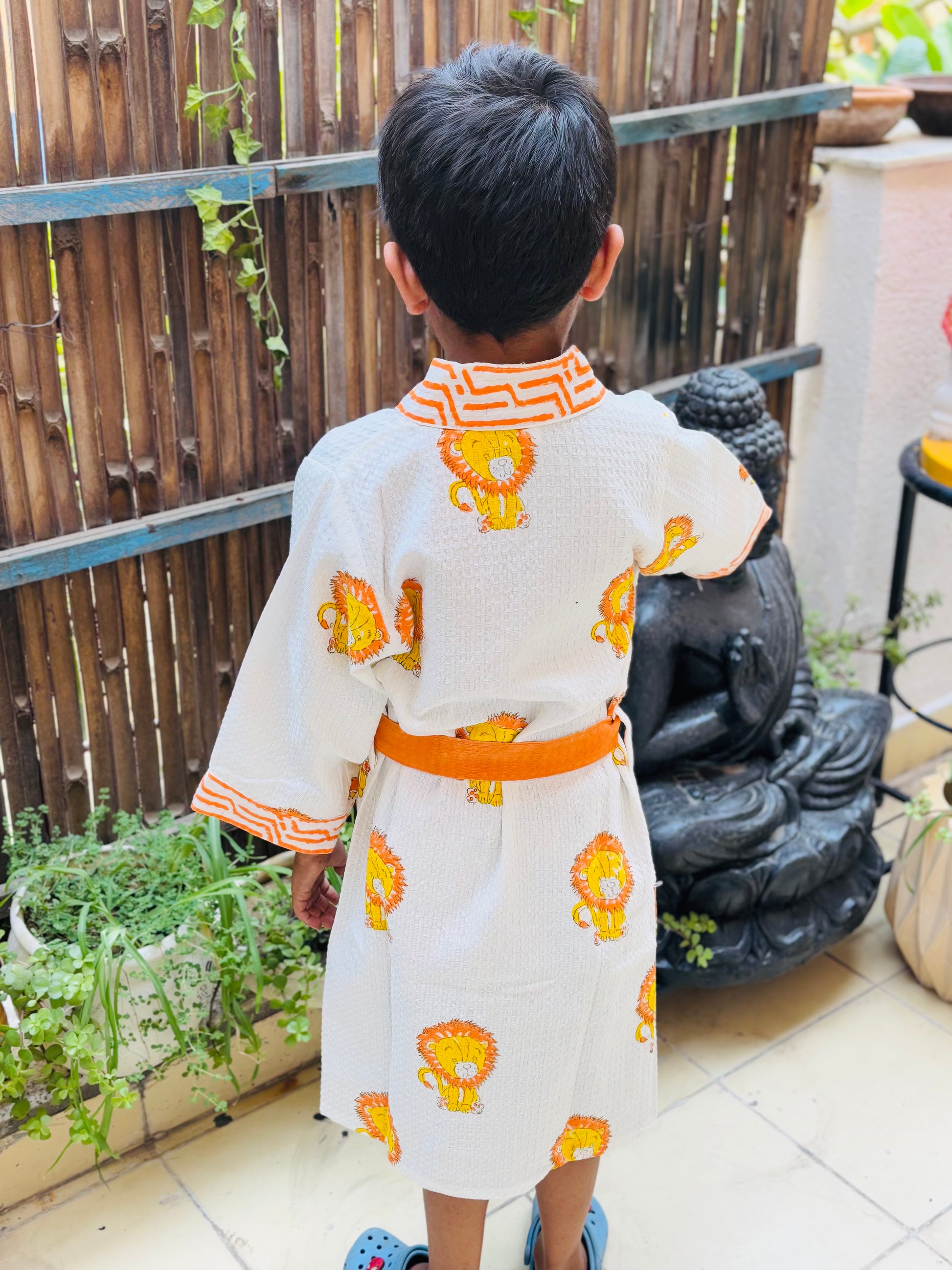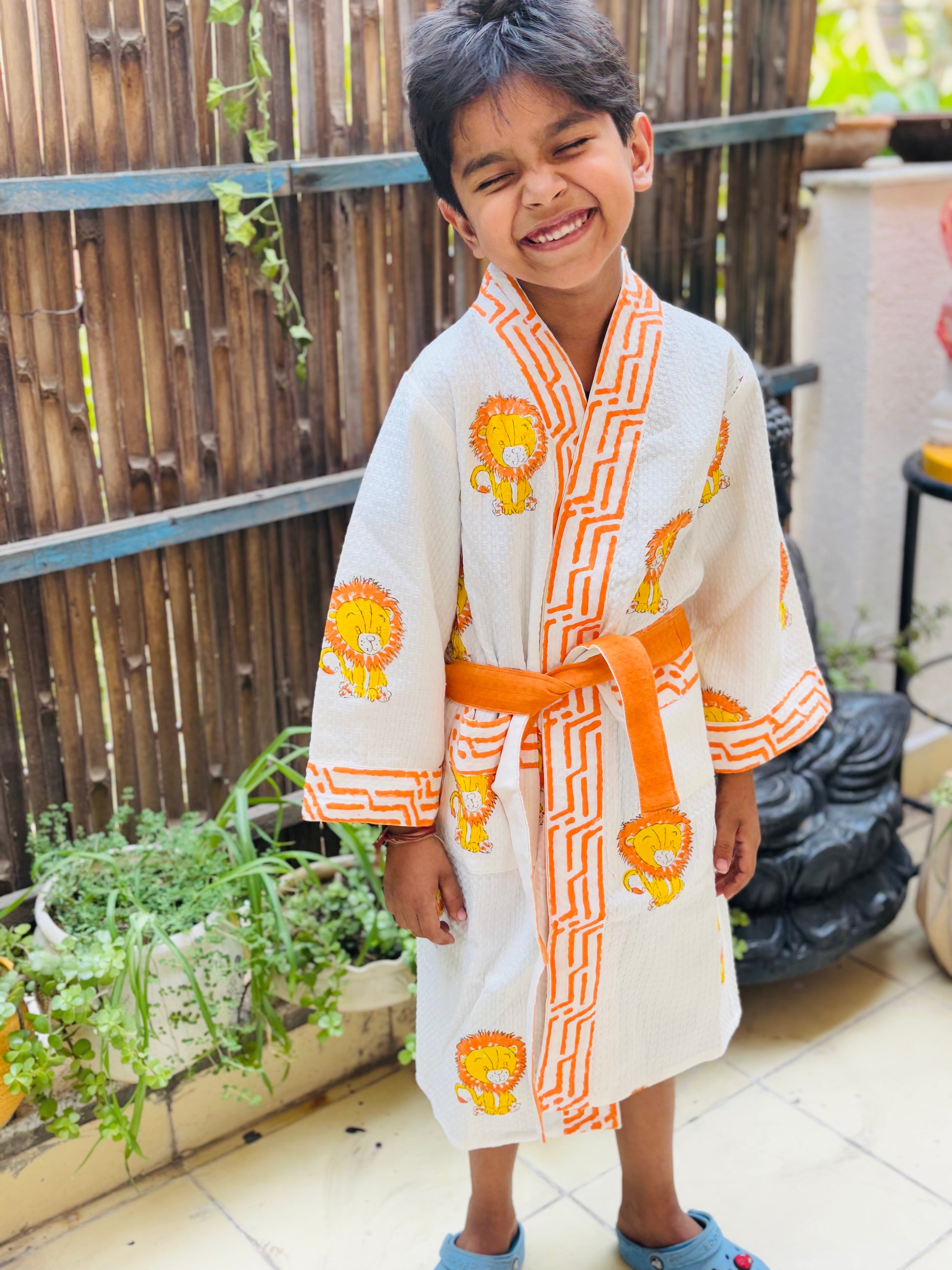 Hand Block Printed Kids Waffle Cotton Bathrobe - Simba