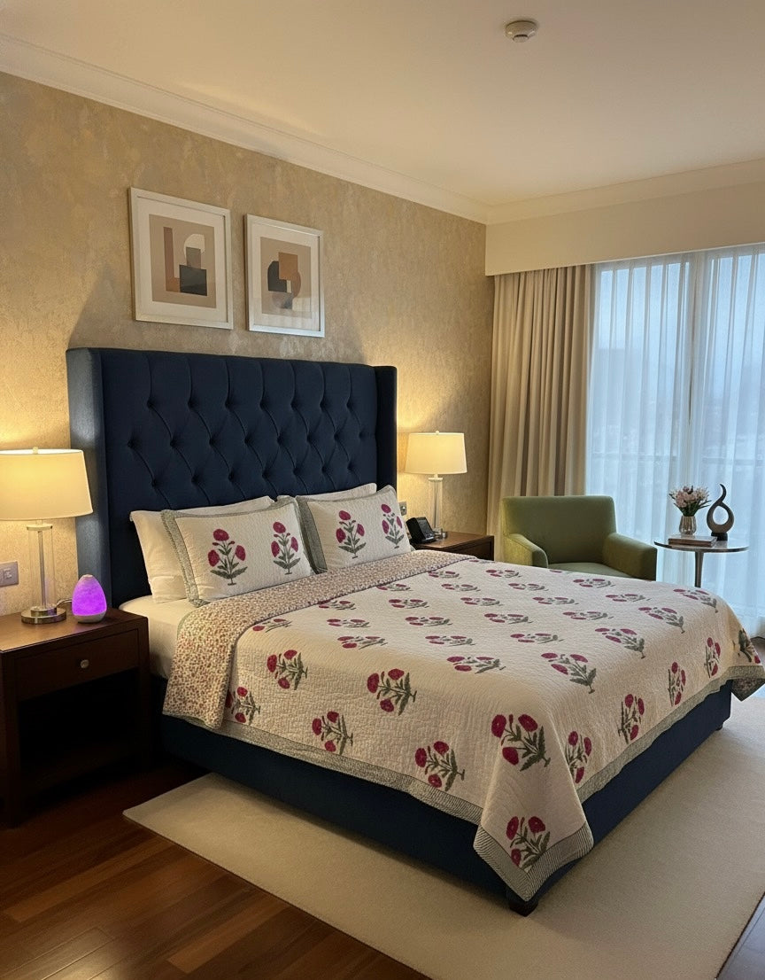 Elevate your bedroom with our exquisitely handcrafted king size quilted bedcover set. Made from premium cotton, this bedcover features intricate quilting that adds texture, durability, and a touch of elegance. Designed for year-round comfort, its lightweight yet cosy feel makes it a perfect addition to your bedding. Each set includes two matching pillow covers to complete the look, blending traditional craftsmanship with modern luxury.