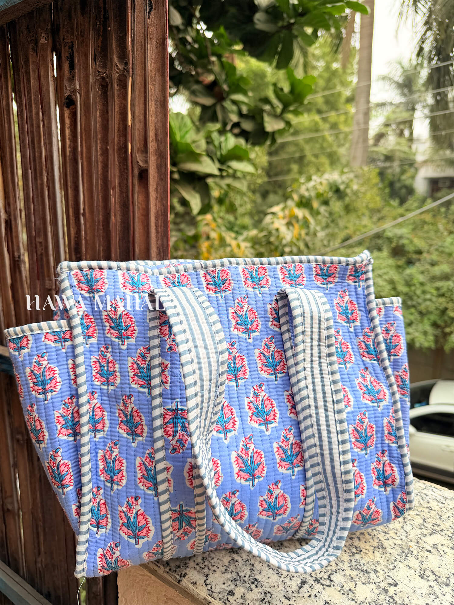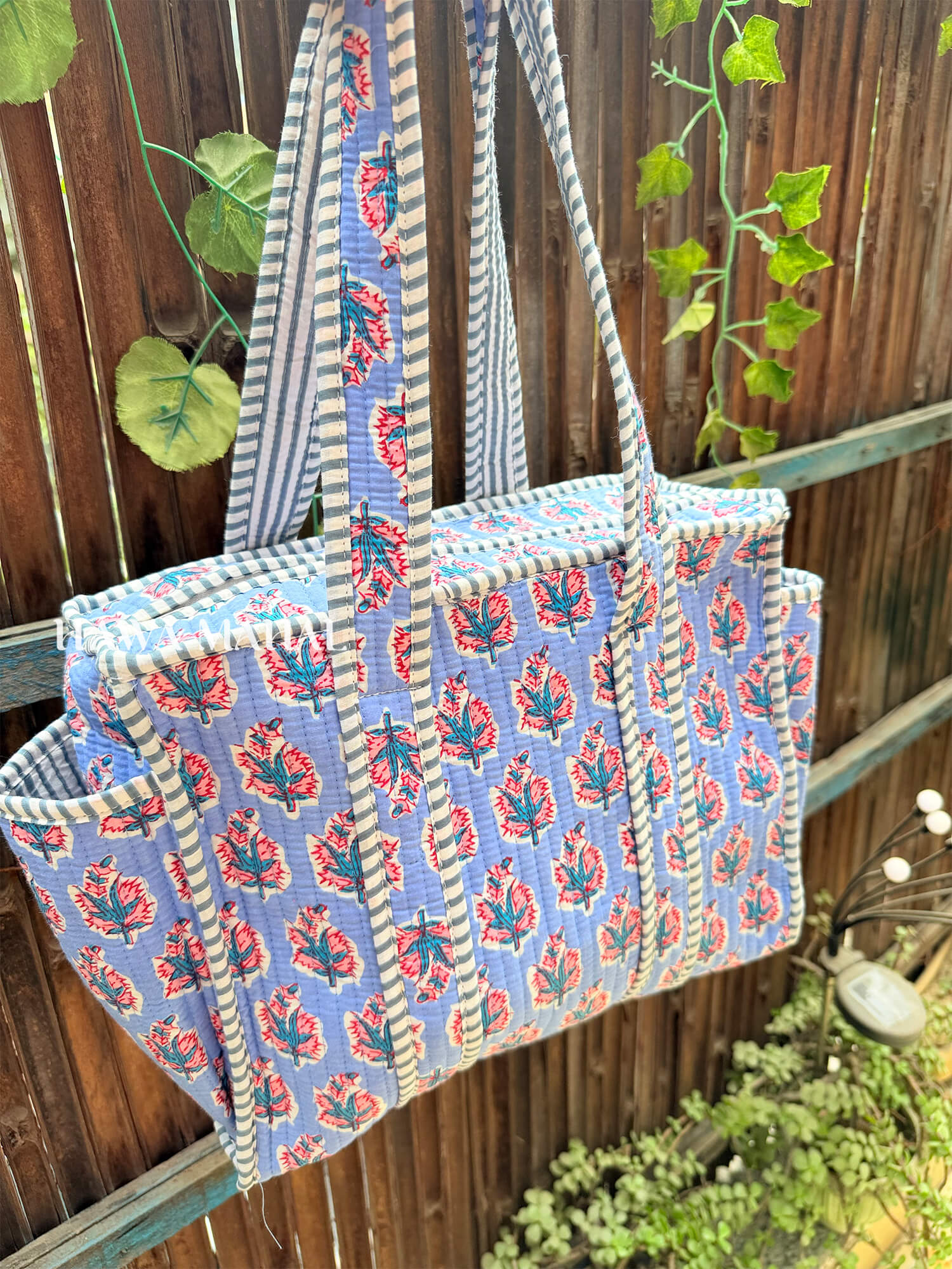 Crafted from durable, washable fabric with traditional block print detailing, this compact tote seamlessly transitions from lunch carrier to travel companion. Thoughtfully designed with dual side bottle holders to keep beverages secure and accessible, the reinforced zipper closure ensures your essentials remain protected.